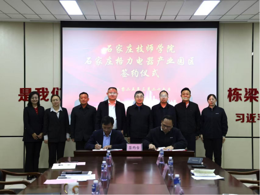 2025年3月26日上午,石家庄技师学院与石家庄格力电器家电产业园举行校企合作签约仪式。石家庄市人社局副局长谢富强、石家庄市工信局副局长杜毅华、高新技术产业开发区经济发展局党组成员、副局长吴波、石家庄格力电器家电产业园园区副总经理冯晓堤、学院党委书记宋志宏出席会议并致辞。签约仪式由院长方建京主持。